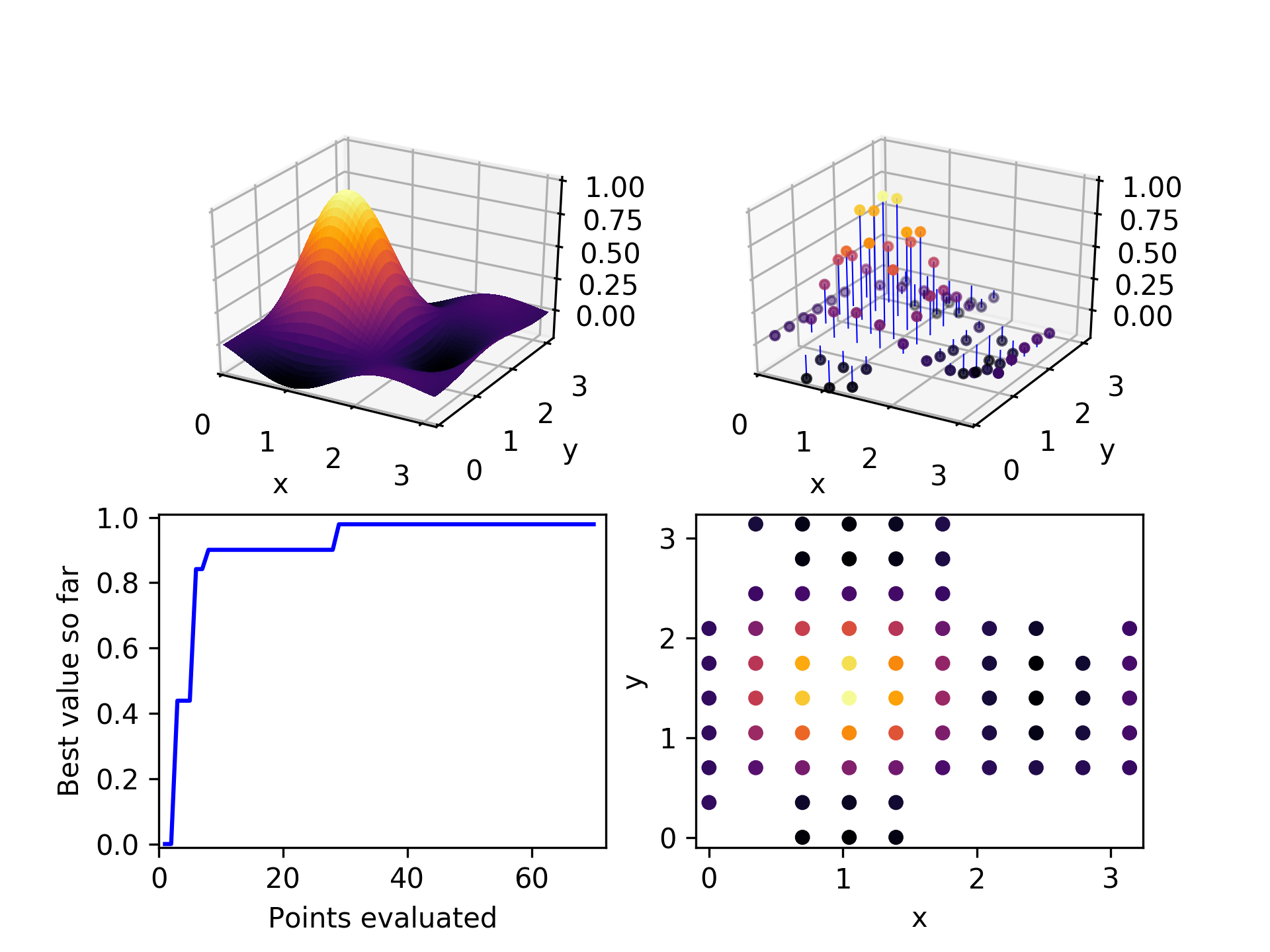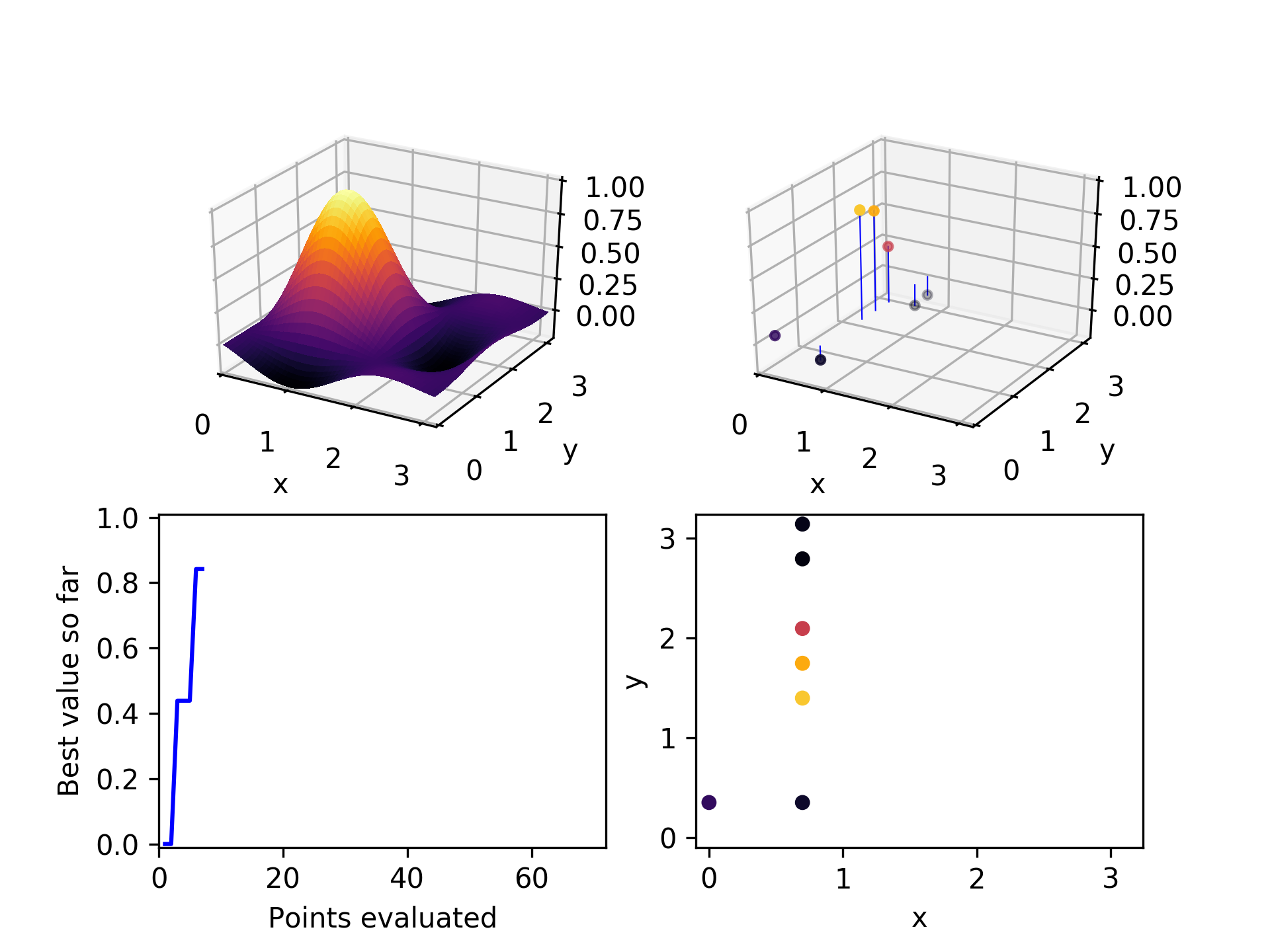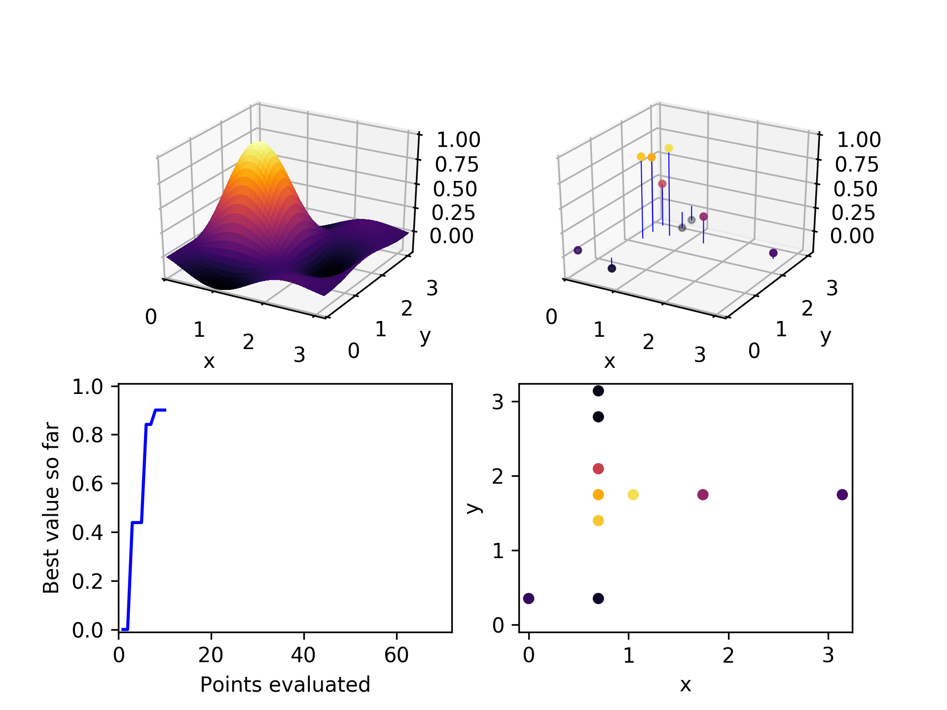 The optimizer actually tries to find the lowest point in the the negative of this function — the global minimum — but for ease of visualization everything is flipped upside down before plotting, so it looks like it's trying to find the top of the peak. Both x and y are allowed to take on 10 distinct values between 0 and 3. The method can be applied to spaces of any number of dimensions, but a two-dimensional space gives the richest visualization.