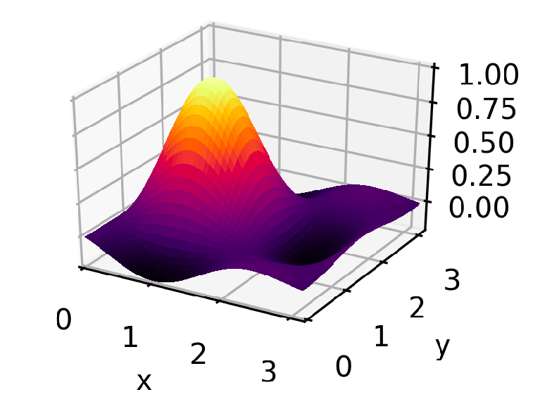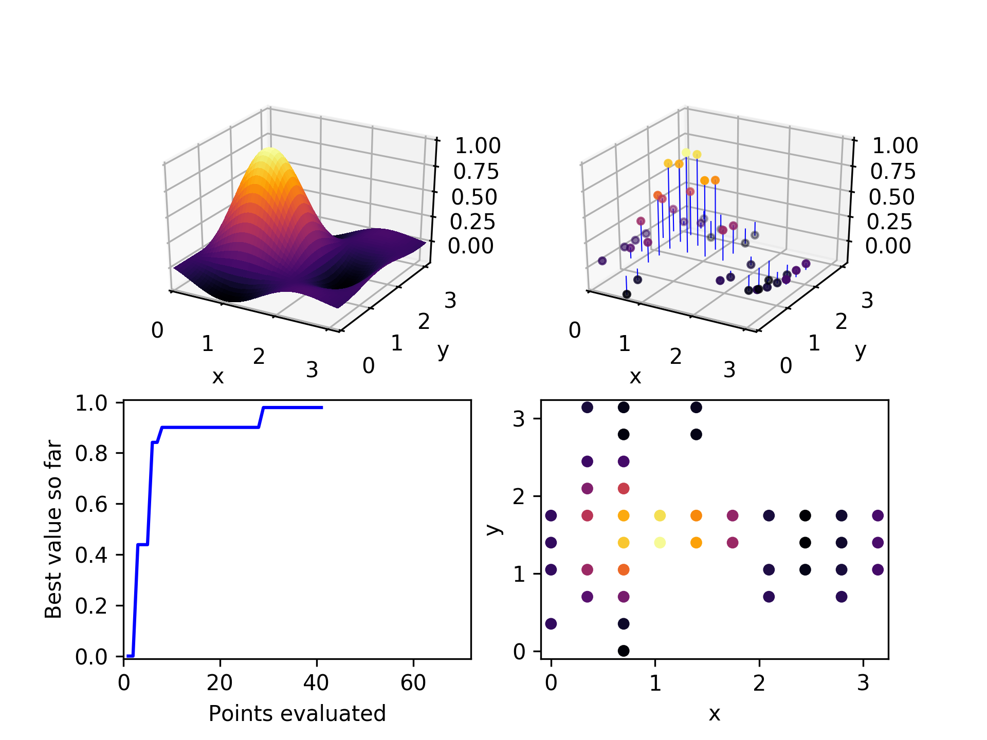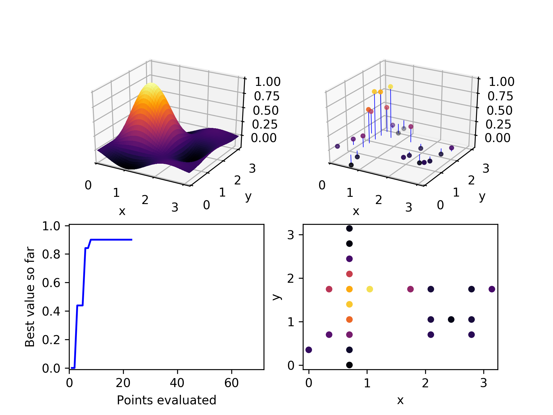The optimizer actually tries to find the lowest point in the the negative of this function — the global minimum — but for ease of visualization everything is flipped upside down before plotting, so it looks like it's trying to find the top of the peak. Both x and y are allowed to take on 10 distinct values between 0 and 3. The method can be applied to spaces of any number of dimensions, but a two-dimensional space gives the richest visualization.
